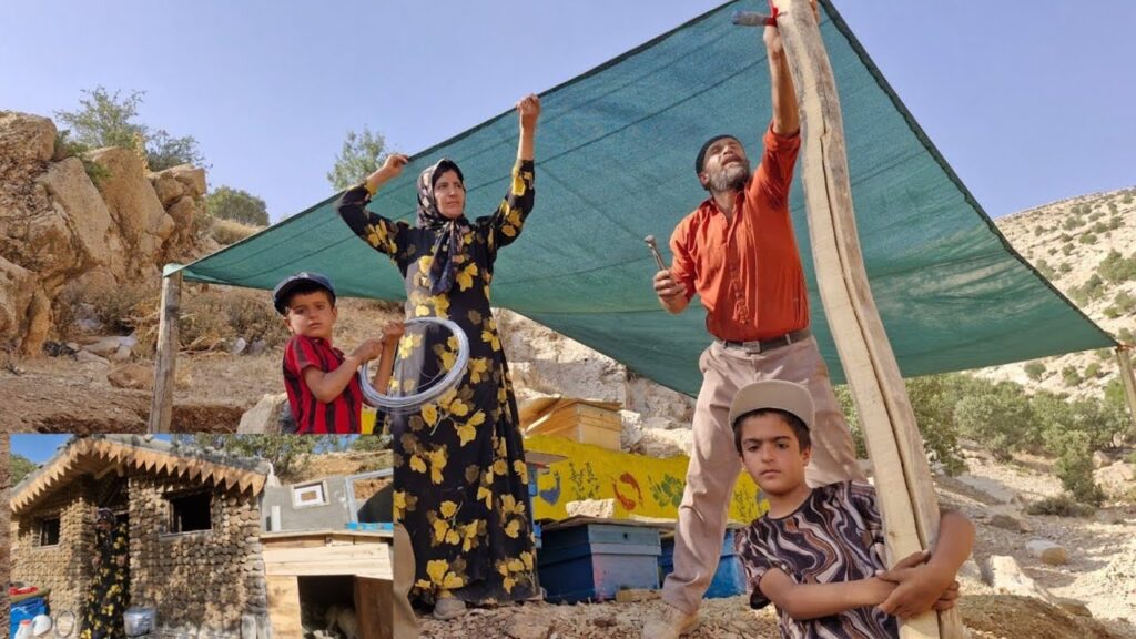 The long-awaited shade cloth for the beehive area is finally ready. With everyone helping, they carefully secure the fabric to the wooden frame—creating a smart, simple, and beautiful cover for the bees.